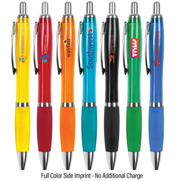 Plastic click-action ballpoint pen with black ink, soft grip and full color side imprint.