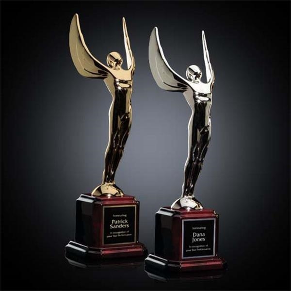 Winged achievement award finished in 24K gold or genuine silver with a bright, polished, satin contrast, and rosewood base.