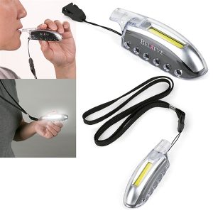 Safety whistle with a bright COB light featuring three modes: dim, bright, and flashing.