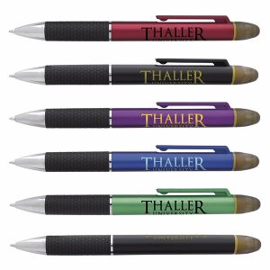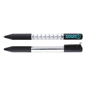 Two-piece gel pen Featuring a soft-touch barrel with rubber grip and a built-in stylus.