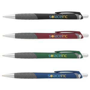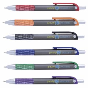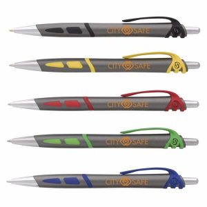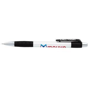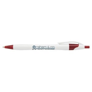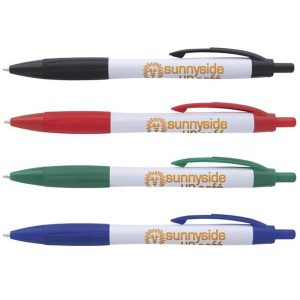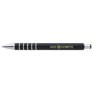 Plunger action pen with 1mm medium ballpoint in black ink. Your choice of trim color with white barrel.
